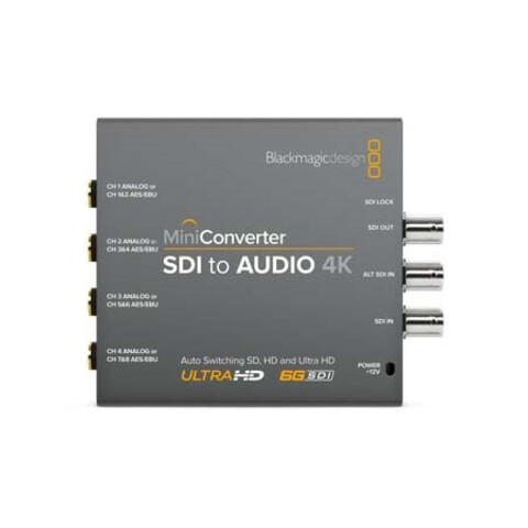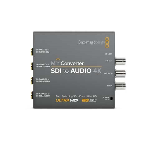 Blackmagic Design Mini Converter SDI to Audio 4K cihazı, SDI video siqnalından audio siqnallarını ayıran (de‑embed) peşəkar mini konverterdir. Bu, SDI video xəttindən daxil olan audioyu çıxarıb audio monitor, mikser və ya digər audio avadanlıqlara ötürmək üçün nəzərdə tutulmuşdur. Sistemdə SDI video siqnalı saxlanılır və eyni zamanda içindəki audio ayrılıb çıxarılır.